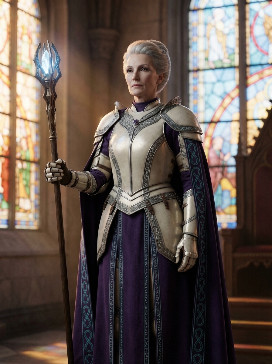 Son aura : responsabilite souveraine deja accomplie. Quand elle entre dans une piece, on ne pense pas "voila une reine" ni "voila une archimage". On pense : "voila l'Empire quand il est bien tenu."